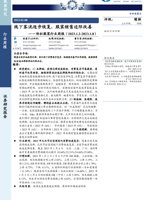 【国泰君安证券】【20230108】20230108-国泰君安-纺织服装行业周报:线下客流逐步恢复,服装销售边际改善-20页