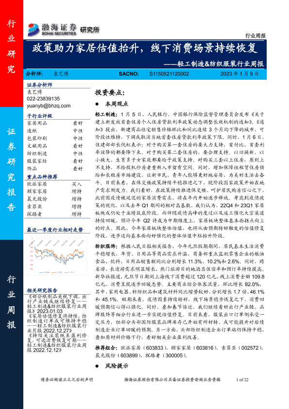 【渤海证券】【20230109】20230109-渤海证券-轻工制造&纺织服装行业周报:政策助力家居估值抬升,线下消费场景持续恢复-22页