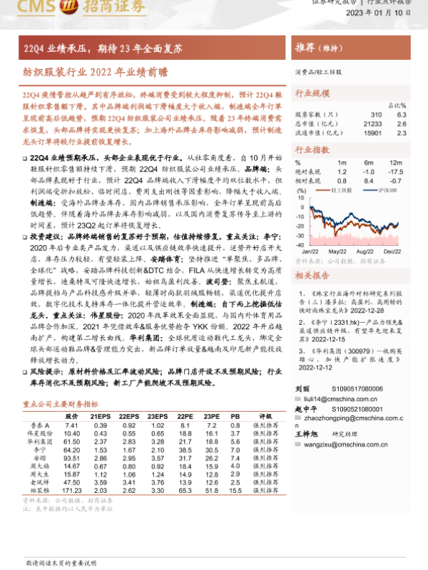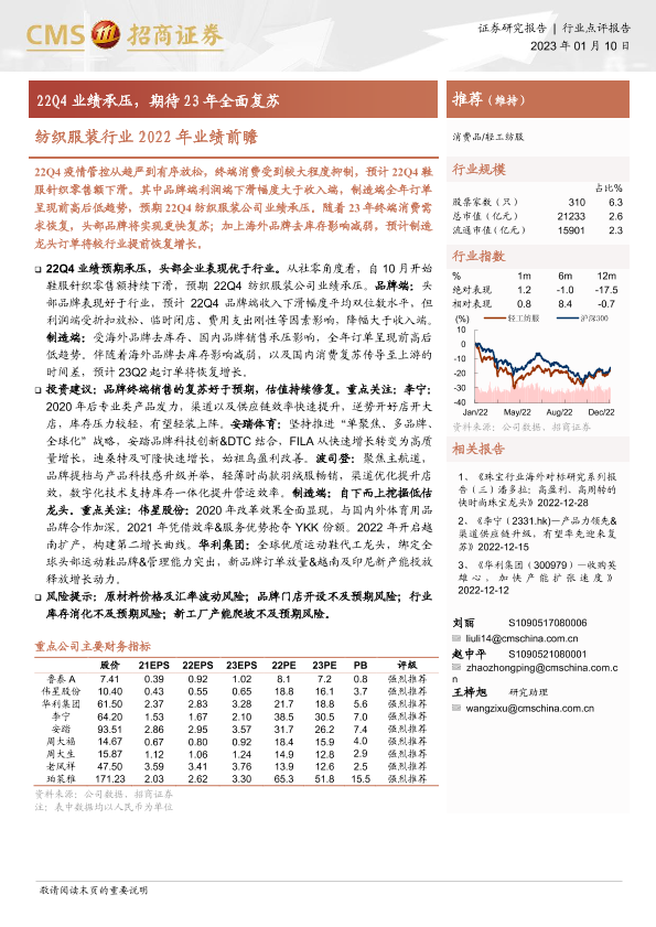 【海通证券】【20230110】纺织服装行业2022年业绩前瞻:22Q4业绩承压,期待23年全面复苏-5页