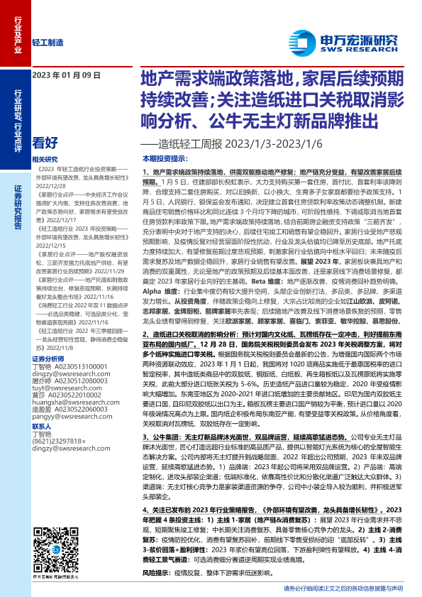 【申万宏源】【20230109】20230109-申万宏源-造纸轻工行业周报:地产需求端政策落地,家居后续预期持续改善;关注造纸进口关税取消影响分析、公牛无主灯新品牌推出-31页