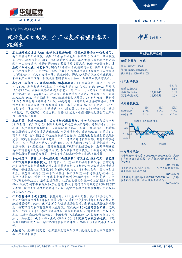 【华创证券】【20230131】传媒行业深度研究报告:疫后复苏之电影,全产业复苏有望和春天一起到来-27页