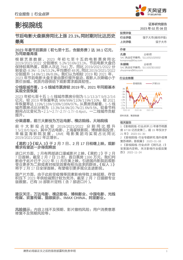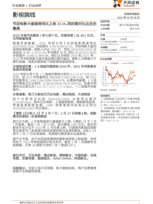 【天风证券】【20230208】影视院线行业:节后电影大盘票房同比上涨23.1%,同时期对比达历史最高-4页