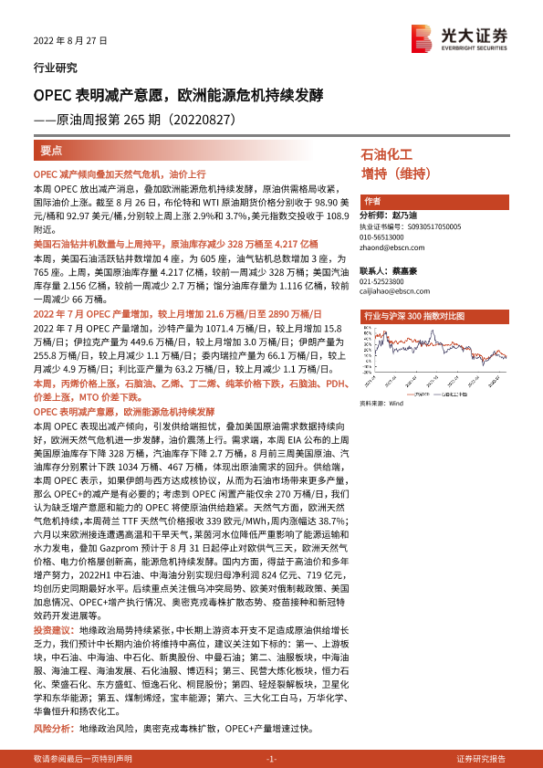 【光大证券】【20220827】石油化工行业原油周报第265期:OPEC表明减产意愿,欧洲能源危机持续发酵-14页