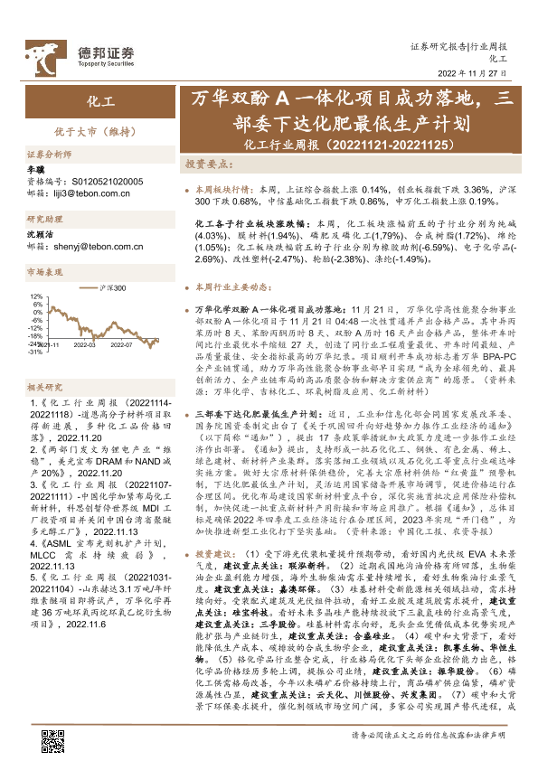 【德邦证券】【20221127】20221127-德邦证券-化工行业周报:万华双酚A一体化项目成功落地,三部委下达化肥最低生产计划-26页