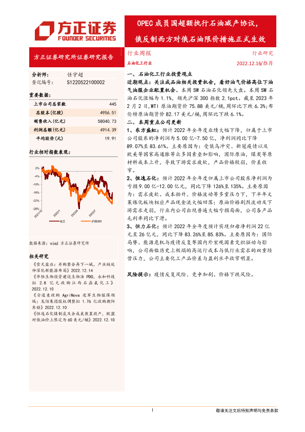 【方正证券】【20221216】20221216-方正证券-石油化工行业周报:OPEC成员国超额执行石油减产协议,俄反制西方对俄石油限价措施正式生效-20页
