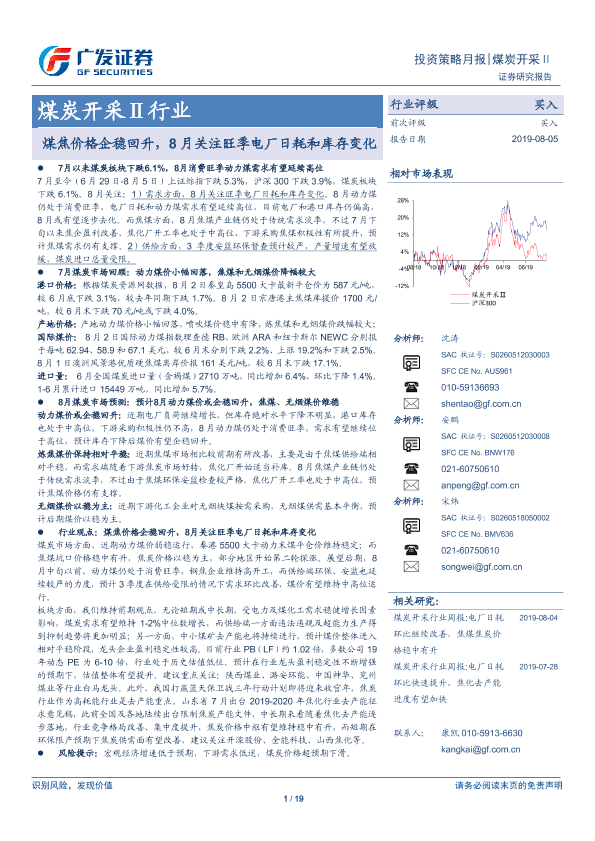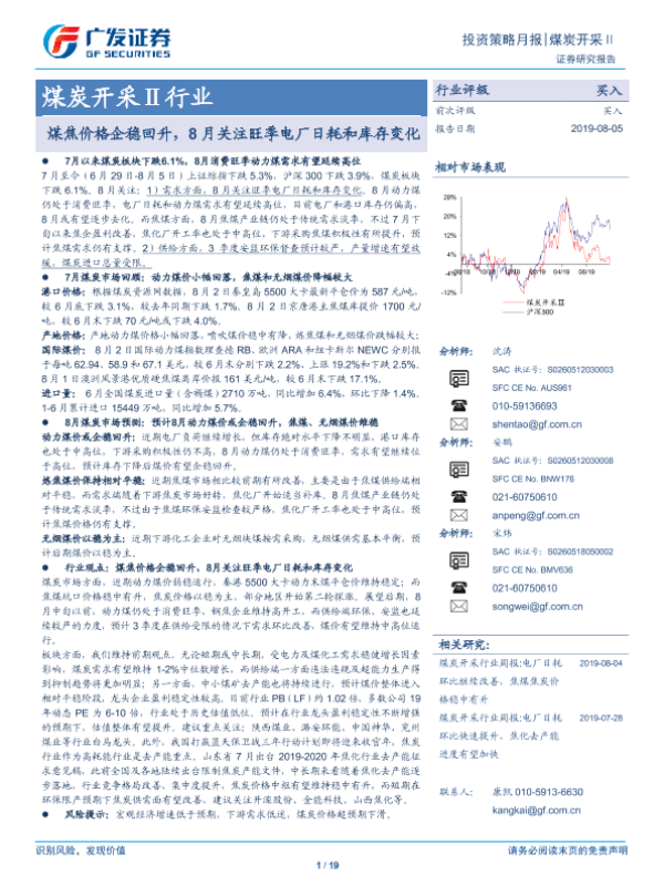 【广发证券】【20190805】煤炭开采行业:煤焦价格企稳回升,8月关注旺季电厂日耗和库存变化-19页