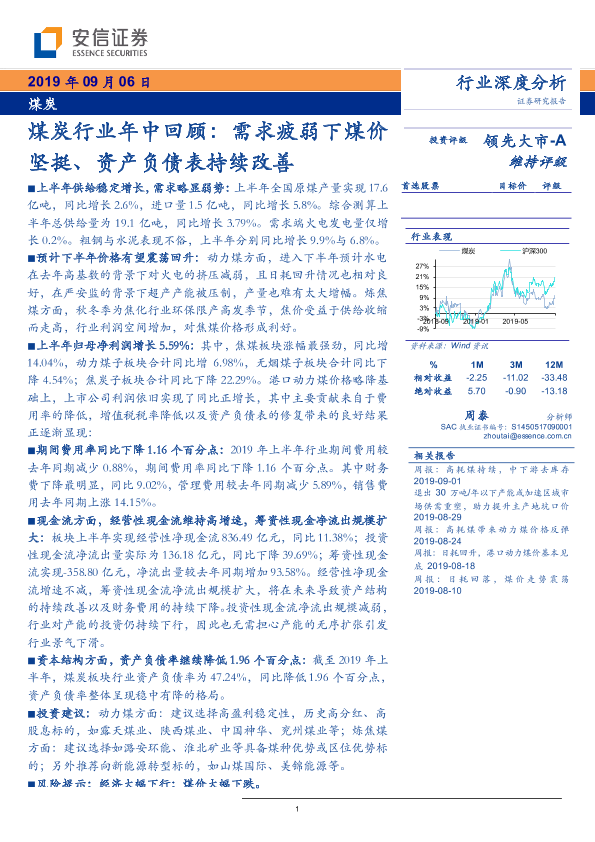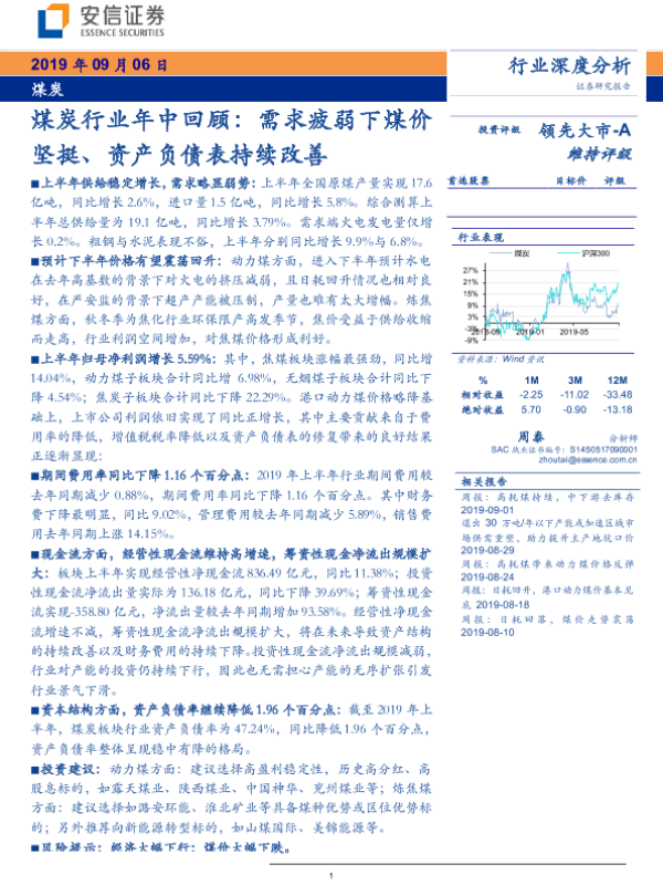 【安信证券】【20190906】煤炭行业年中回顾:需求疲弱下煤价坚挺、资产负债表持续改善-20页