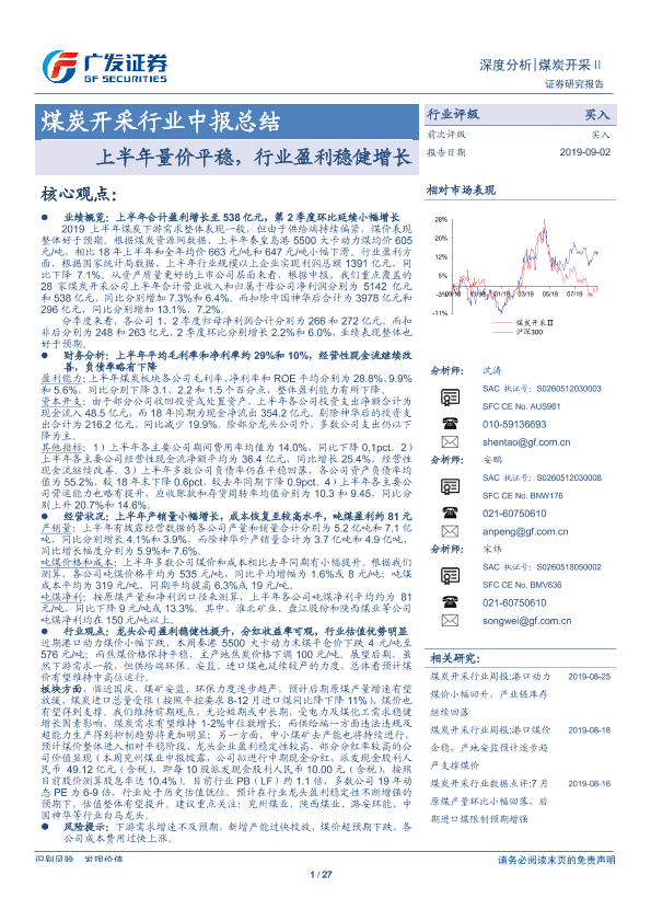 【广发证券】【20190902】煤炭开采行业中报总结:上半年量价平稳,行业盈利稳健增长-27页