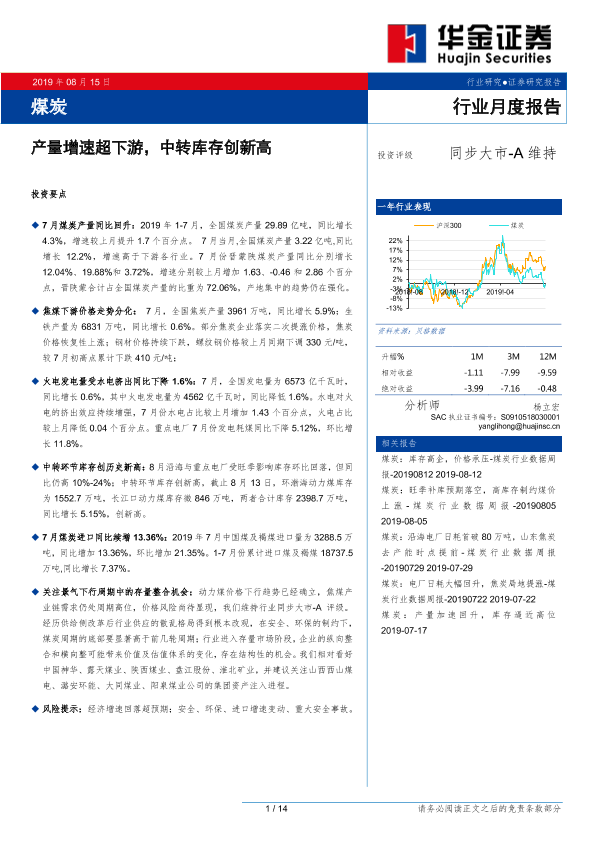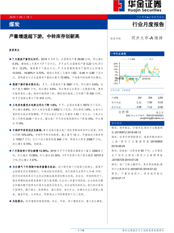 【华金证券】【20190815】煤炭行业月度报告:产量增速超下游,中转库存创新高-14页