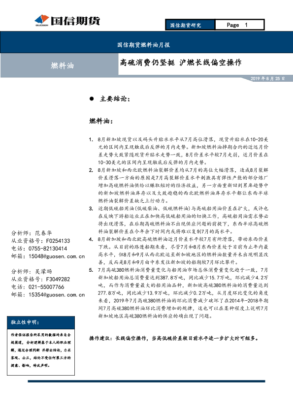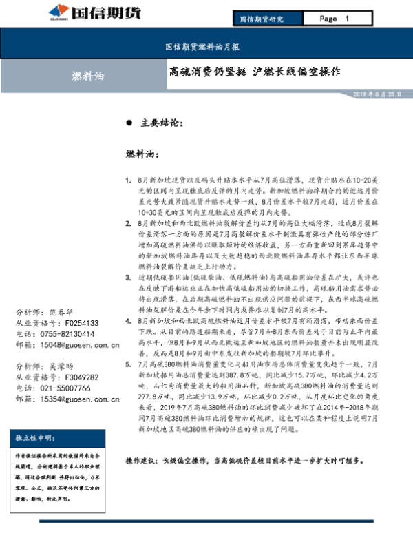 【国信期货】【20190825】燃料油月报:高硫消费仍坚挺,沪燃长线偏空操作-10页