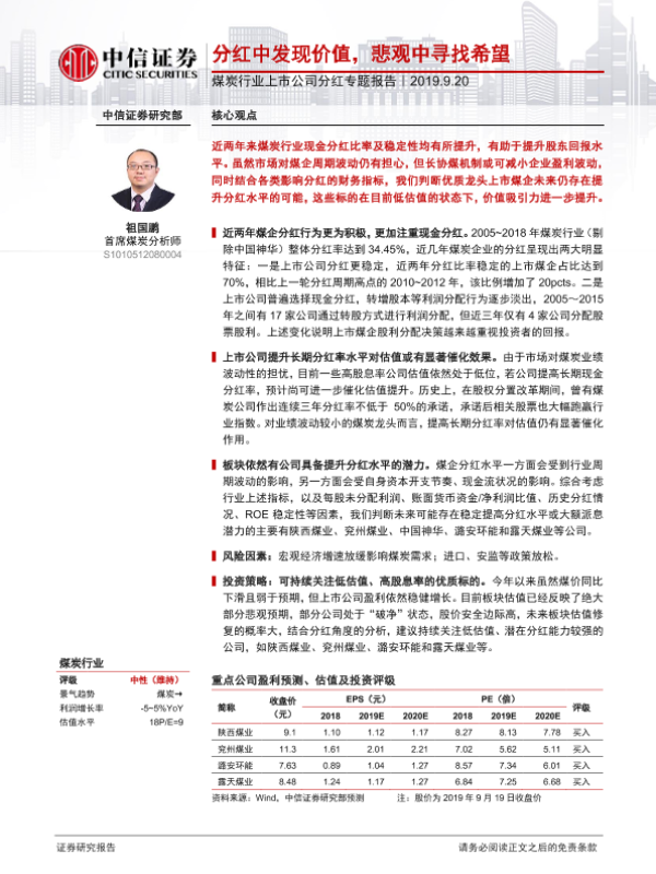 【中信证券】【20190920】煤炭行业上市公司分红专题报告:分红中发现价值,悲观中寻找希望-16页