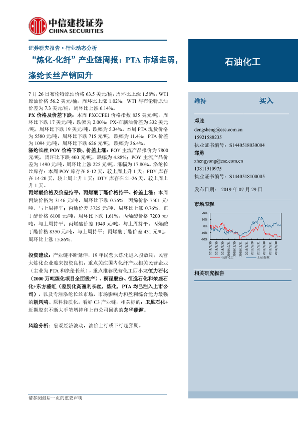 【中信建投证券】【20190729】石油化工行业“炼化~化纤”产业链:PTA市场走弱,涤纶长丝产销回升-30页