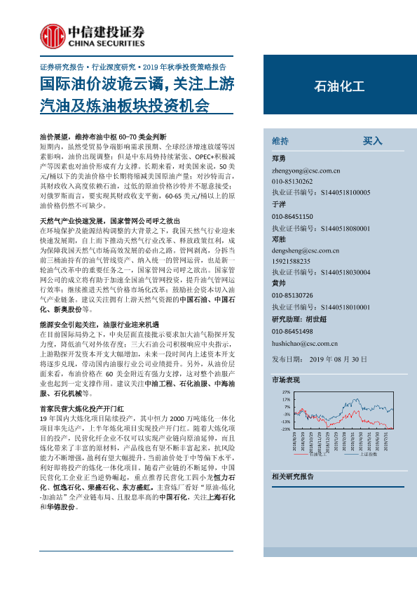 【中信建投证券】【20190830】石油化工行业2019年秋季投资策略报告:国际油价波诡云谲,关注上游汽油及炼油板块投资机会-51页
