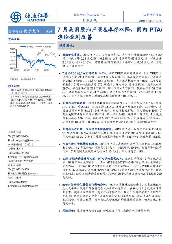 【海通证券】【20190819】石油化工行业月报:7月美国原油产量&库存双降,国内PTA/涤纶盈利改善-10页