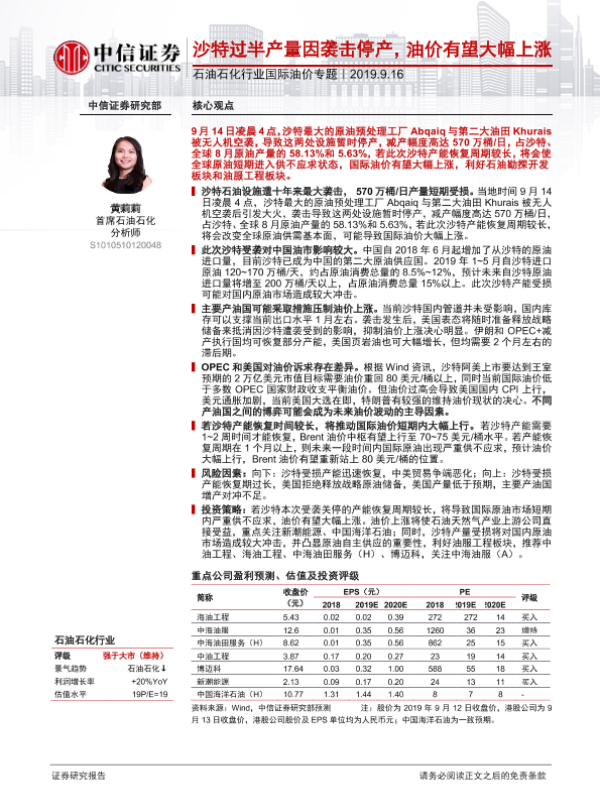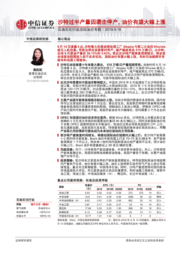 【中信证券】【20190916】石油石化行业国际油价专题:沙特过半产量因袭击停产,油价有望大幅上涨-13页