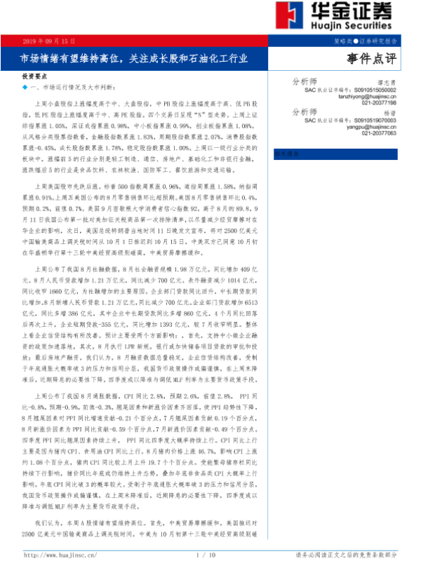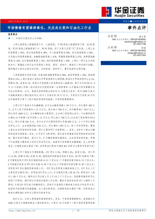 【华金证券】【20190915】事件点评:市场情绪有望维持高位,关注成长股和石油化工行业-10页