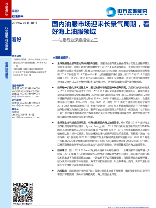【申万宏源】【20190730】油服行业深度报告之三:国内油服市场迎来长景气周期,看好海上油服领域-28页