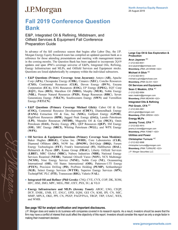 【J.P. Morgan】【20190829】J.P. 摩根-美股-石油与天然气行业-2019年秋季会议问题库:整装油与炼油、石油服务与设备等秋季会议筹备指南-165页