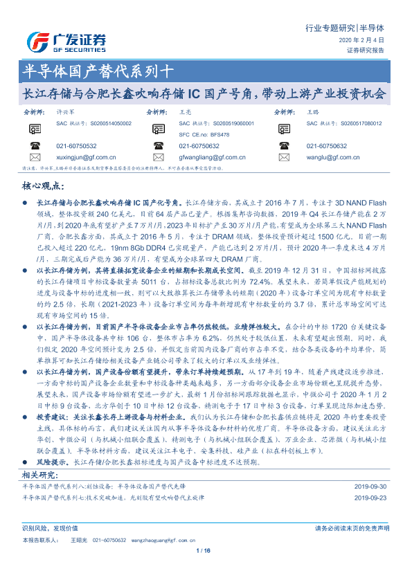 【广发证券】【20200204】半导体行业国产替代系列十:长江存储与合肥长鑫吹响存储IC国产号角,带动上游产业投资机会-17页