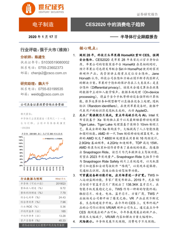【世纪证券】【20200117】半导体行业跟踪报告:CES2020中的消费电子趋势-11页