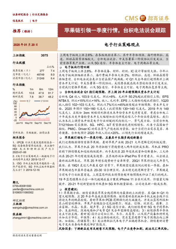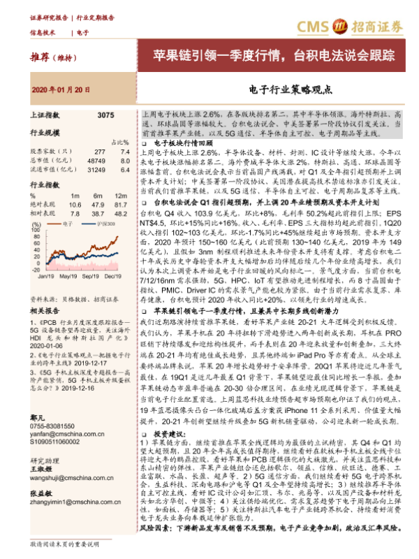 【海通证券】【20200120】电子行业策略观点:苹果链引领一季度行情,台积电法说会跟踪-26页