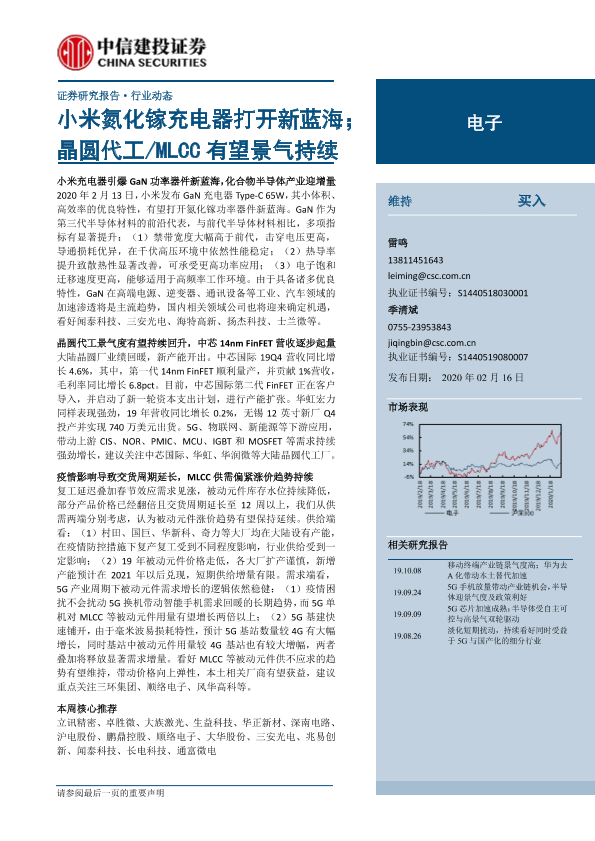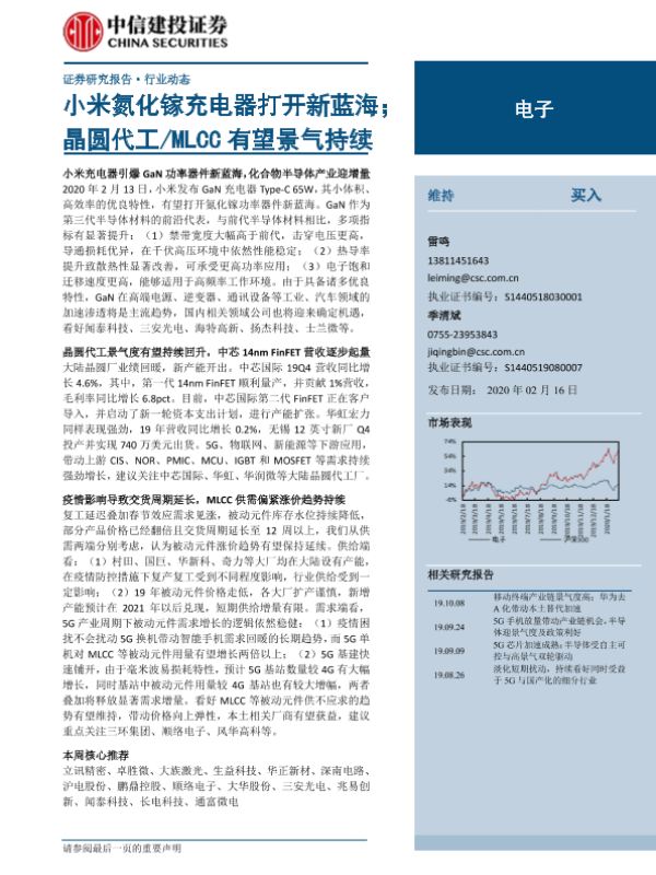 【中信建投证券】【20200216】电子行业动态:小米氮化镓充电器打开新蓝海;晶圆代工MLCC有望景气持续-15页