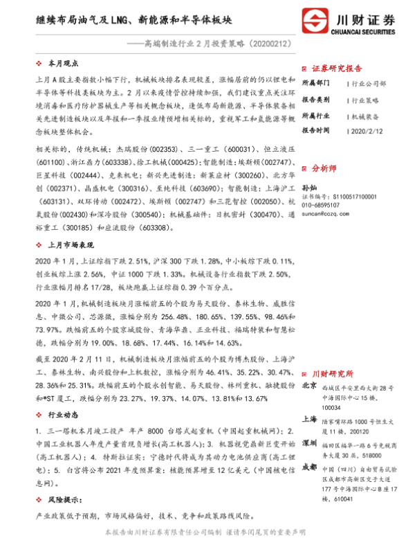 【川财证券】【20200212】高端制造行业2月投资策略:继续布局油气及LNG、新能源和半导体板块-25页