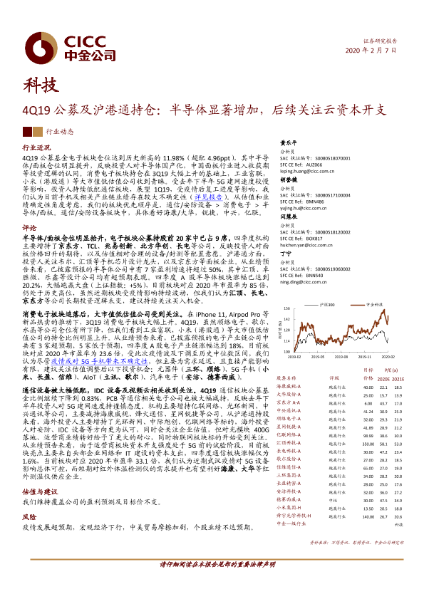 【中金公司】【20200207】4Q19公募及沪港通持仓:半导体显著增加,后续关注云资本开支-17页