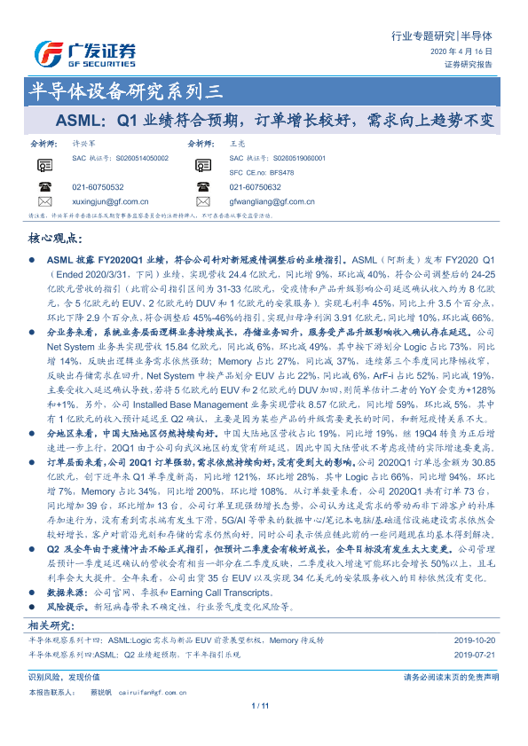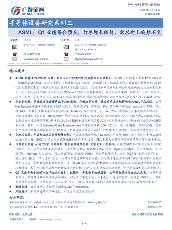 【广发证券】【20200416】半导体行业设备研究系列三:ASML,Q1业绩符合预期,订单增长较好,需求向上趋势不变-12页