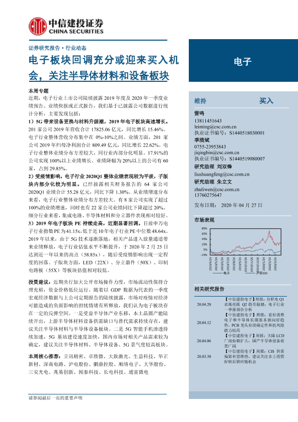 【中信建投证券】【20200427】电子行业:电子板块回调充分或迎来买入机会,关注半导体材料和设备板块-26页