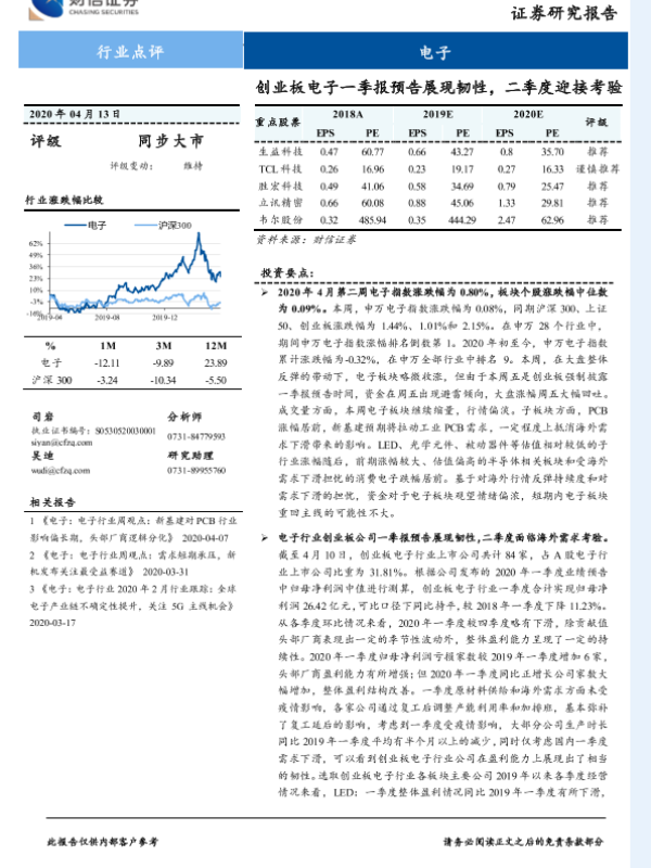 【财信证券】【20200413】电子行业点评:创业板电子一季报预告展现韧性,二季度迎接考验-17页