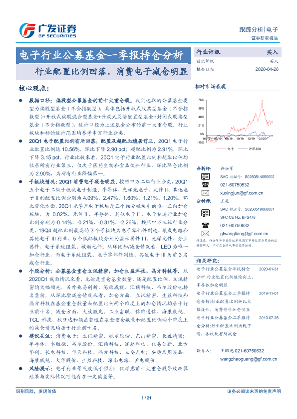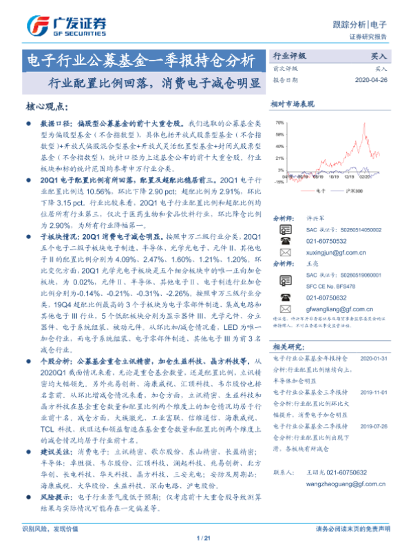 【广发证券】【20200426】电子行业公募基金一季报持仓分析:行业配置比例回落,消费电子减仓明显-21页