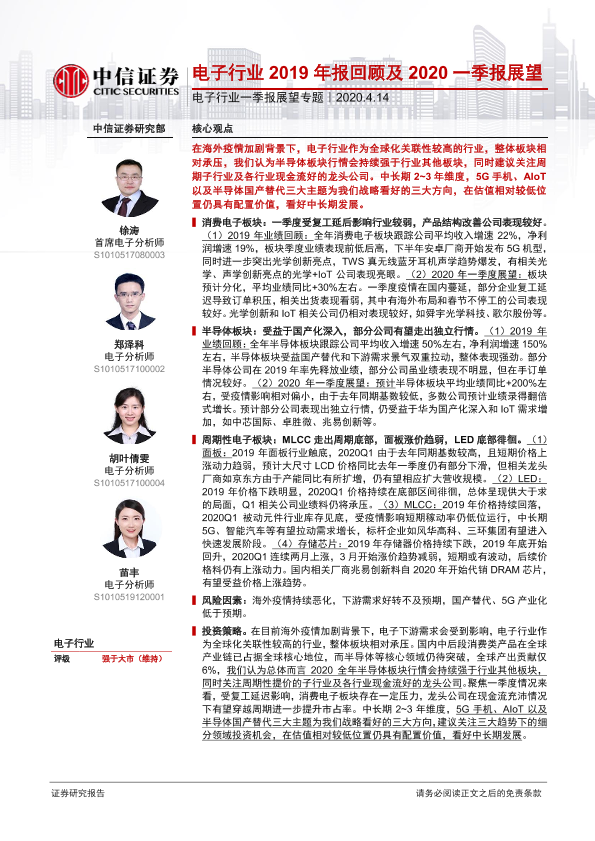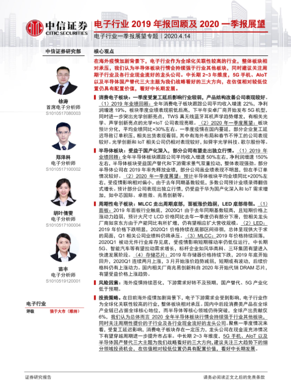 【中信证券】【20200414】电子行业一季报展望专题:电子行业2019年报回顾及2020一季报展望-12页