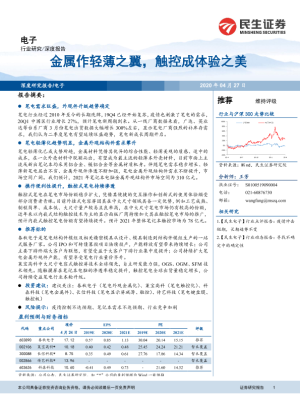 【民生证券】【20200426】电子行业深度报告:金属作轻薄之翼,触摸成体验之美-25页