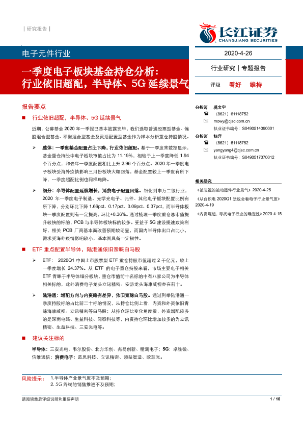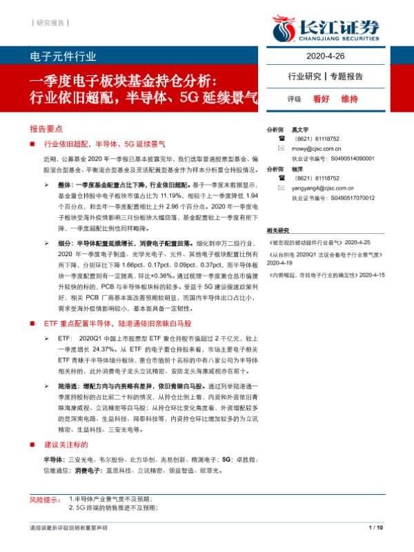【长江证券】【20200426】电子元件行业一季度电子板块基金持仓分析:行业依旧超配,半导体、5G延续景气-10页