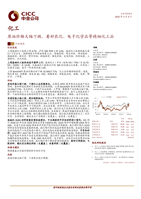 【中金公司】【20200309】化工行业:原油价格大幅下跌,看好农化、电子化学品等精细化工品-18页