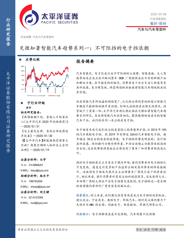 【太平洋证券】【20200308】汽车与汽车零部件行业见微知著智能汽车趋势系列一:不可阻挡的电子挡浪潮-16页