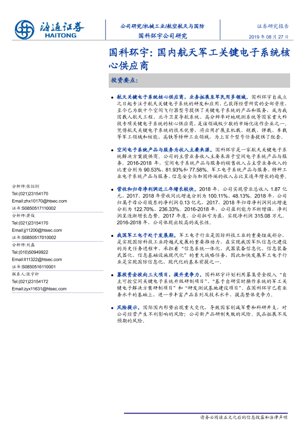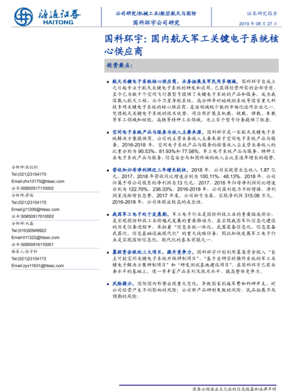 【海通证券】【20190827】航空航天与国防行业:国科环宇,国内航天军工关键电子系统核心供应商-20页