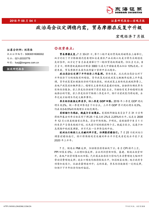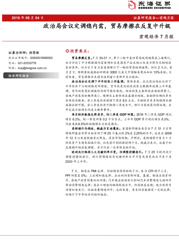 【东海证券】【20190804】宏观经济7月报:政治局会议定调稳内需,贸易摩擦在反复中升级-46页