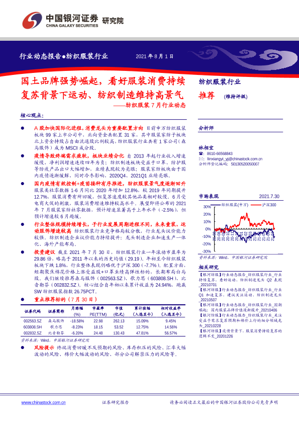 【银河证券】【20210801】纺织服装行业7月行业动态:国土品牌强势崛起,看好服装消费持续复苏背景下运动、纺织制造维持高景气-24页