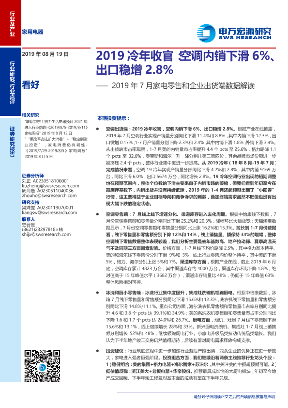 【申万宏源】【20190819】家用电器行业2019年7月份家电零售和企业出货端数据解读:2019冷年收官,空调内销下滑6%、出口稳增2.8%-15页