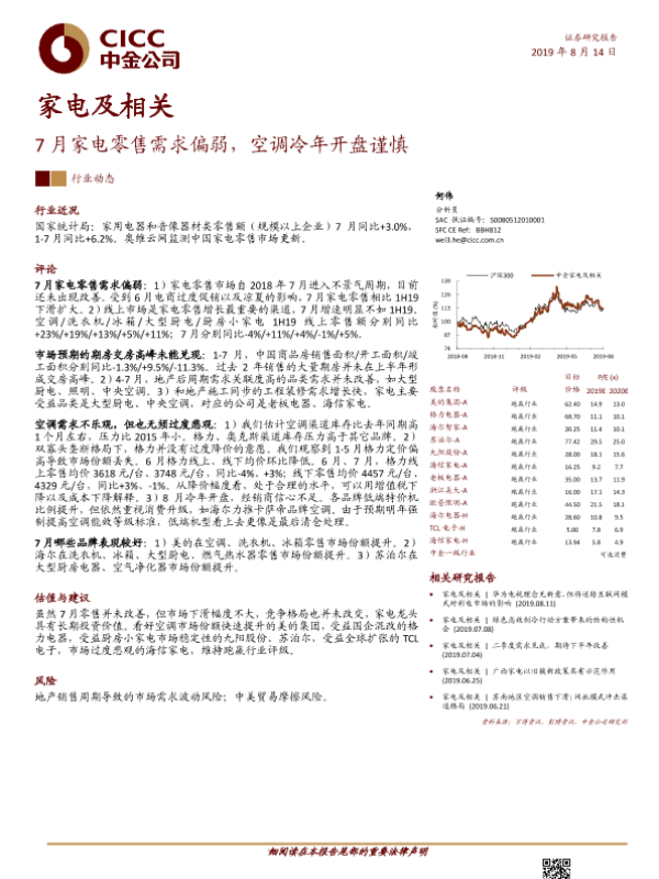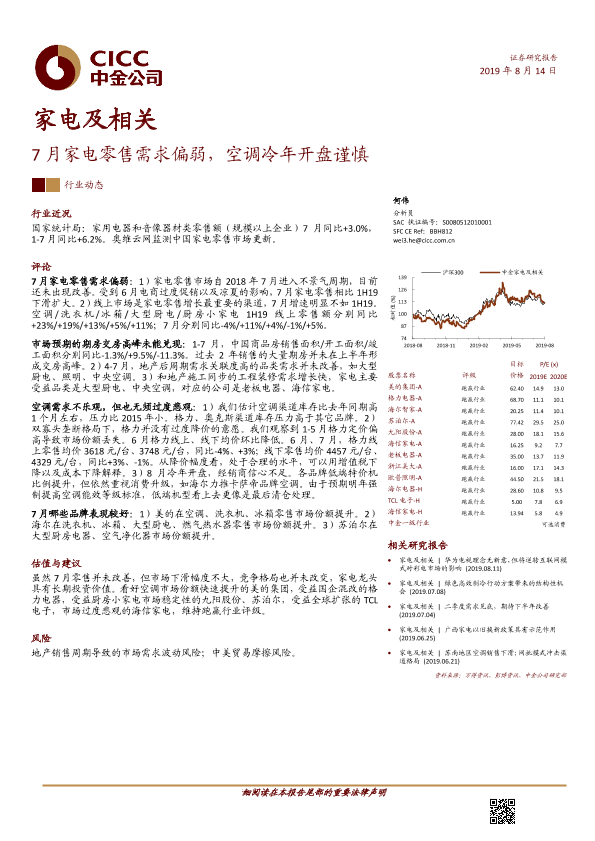 【中金公司】【20190814】家电及相关行业:7月家电零售需求偏弱,空调冷年开盘谨慎-10页