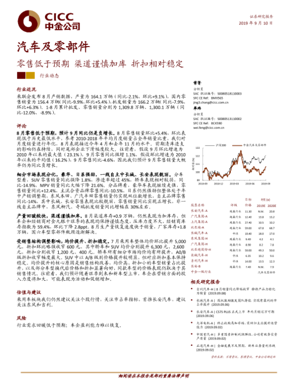 【中金公司】【20190910】汽车及零部件行业:零售低于预期,渠道谨慎加库,折扣相对稳定-11页