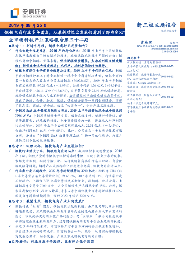 【安信证券】【20190825】全市场科技产业策略报告第三十二期:钢铁电商行业多年蓄力,从最新财报出发我们看到了哪些变化?-28页