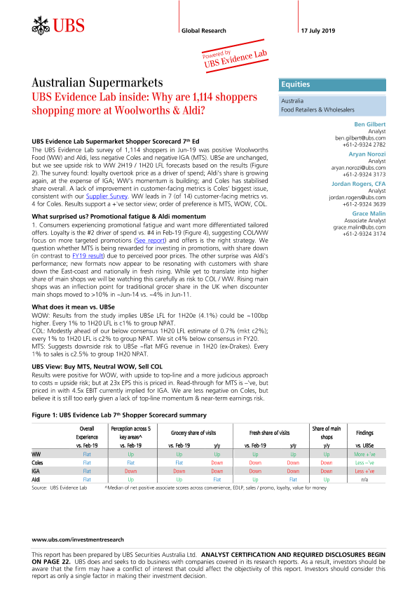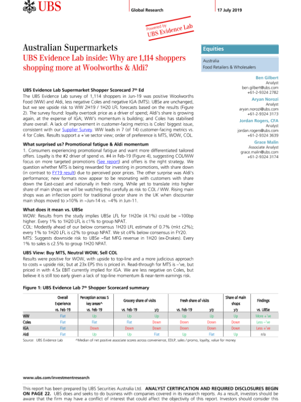 【UBS Securities Australia Ltd.】【20190717】瑞银-澳大利亚-零售行业-澳大利亚超市业:为什么1114名购物者在Woolworths & Aldi购物更多?-28页