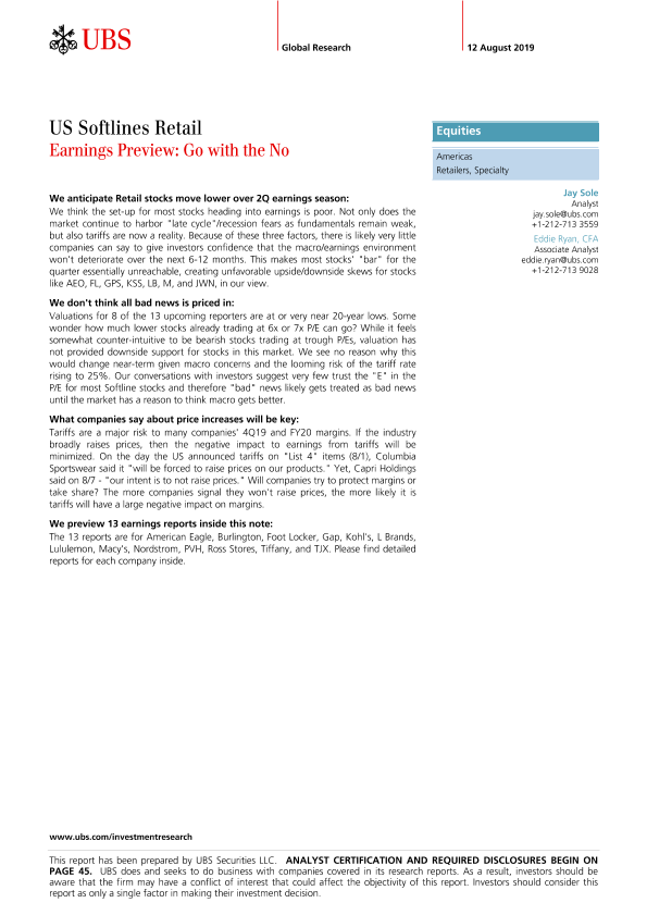 【瑞银】【20190801】瑞银-美股-零售行业-美国软线零售业业绩预览-50页