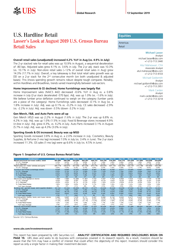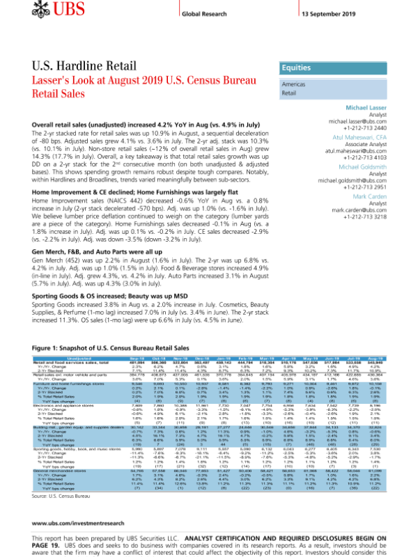 【瑞银】【20190913】瑞银-美股-零售业-美国硬线零售:2019年8月美国人口普查局零售额分析-23页
