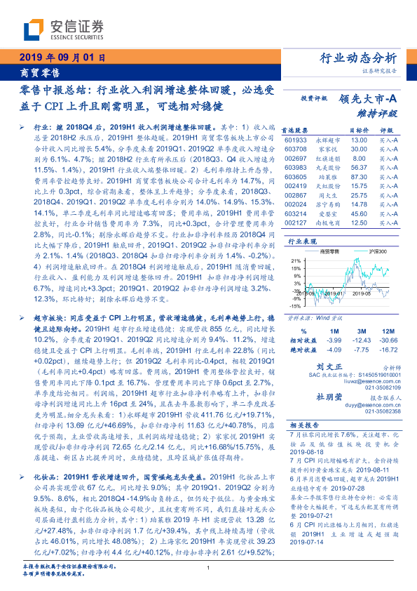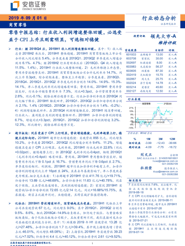 【安信证券】【20190901】商贸零售行业零售中报总结:收入利润增速整体回暖,必选受益于CPI上升且刚需明显,可选相对稳健-27页