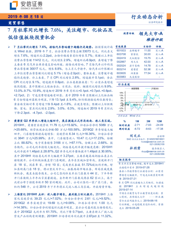 【安信证券】【20190818】商贸零售行业:7月社零同比增长7.6%,关注超市、化妆品及低估值板块投资机会-24页