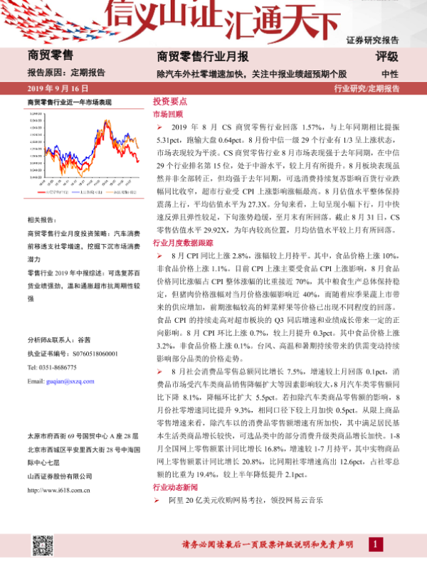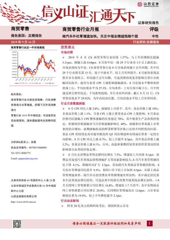 【山西证券】【20190916】商贸零售行业月报:除汽车外社零增速加快,关注中报业绩超预期个股-15页